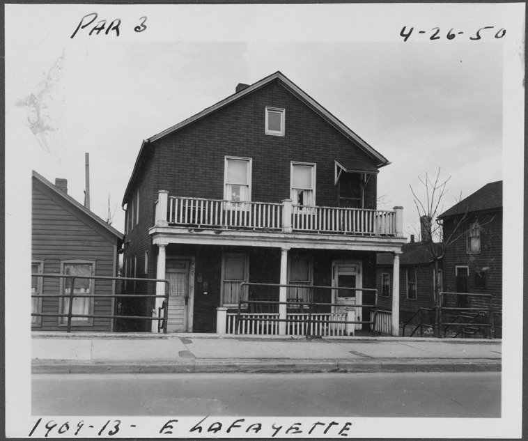 View of two-story front-gabled house with simulated brick siding, possibly a duplex, located at 1909-1913 E. Lafayette, parcel 3, in the area bounded by Dequindre/Chene/Lafayette/Monroe, site 2-S-4. House has two front entrances and covered entry porch. Handwritten on front: "Par. 3, 1909-13 E. Lafayette, 4-26-50."