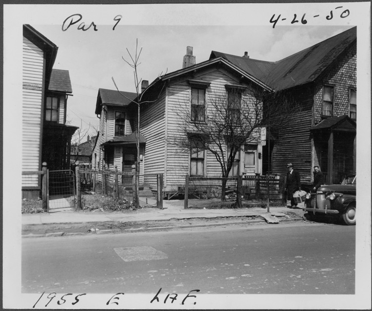 View of two-story wooden-frame house located at 1955 E. Lafayette, parcel 9, in the area bounded by Dequindre/Chene/Lafayette/Monroe, site 2-S-4. Two men stand on sidewalk. Handwritten on front: "Par. 9, 1955 E. Laf., 4-26-50."