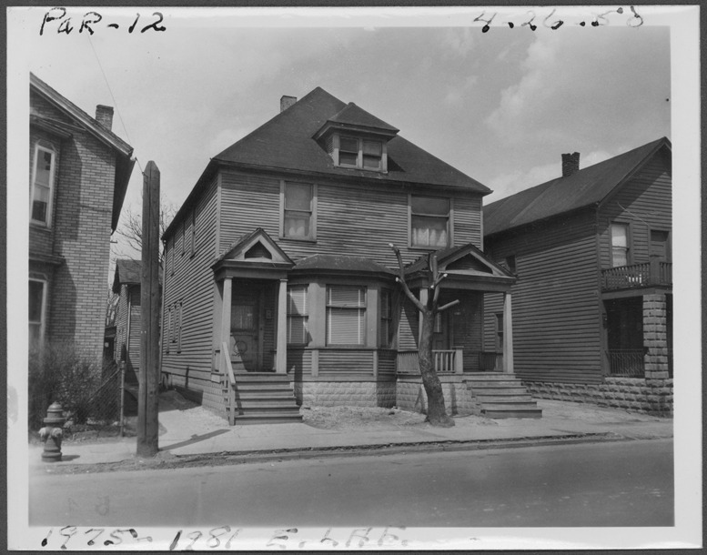 View of two-story wooden-frame house, possibly a duplex, located at 1975-1981 E. Lafayette, parcel 12, in the area bounded by Dequindre/Chene/Lafayette/Monroe, site 2-S-4. House has two front entrances and covered entry porches. Handwritten on front: "Par. 12, 1975-81 E. Laf. 4-26-50."
