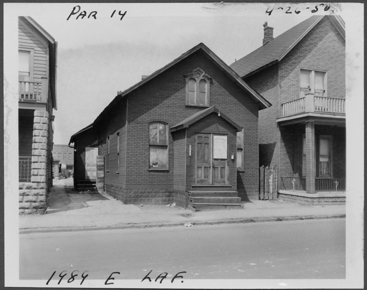 View of two-story building with simulated brick siding, located at 1989 E. Lafayette, parcel 14, in the area bounded by Dequindre/Chene/Lafayette/Monroe, site 2-S-4. Sign on front door: "Abyssinia ... Church ... " Handwritten on front: "Par. 14, 1989 E. Laf. 4-26-50."