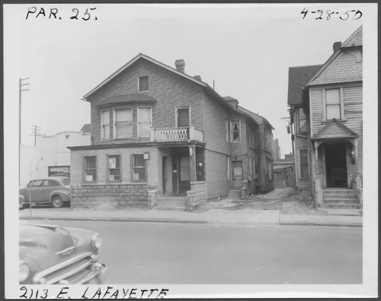 View of two-story house with simulated brick siding located at 2113 E. Lafayette, parcel 25, in the area bounded by Dequindre/Chene/Lafayette/Monroe, site 2-S-4. House has bay window on second story and covered entry porch. Handwritten on front: "Par. 25, 2113 E. Lafayette, 4-28-50."
