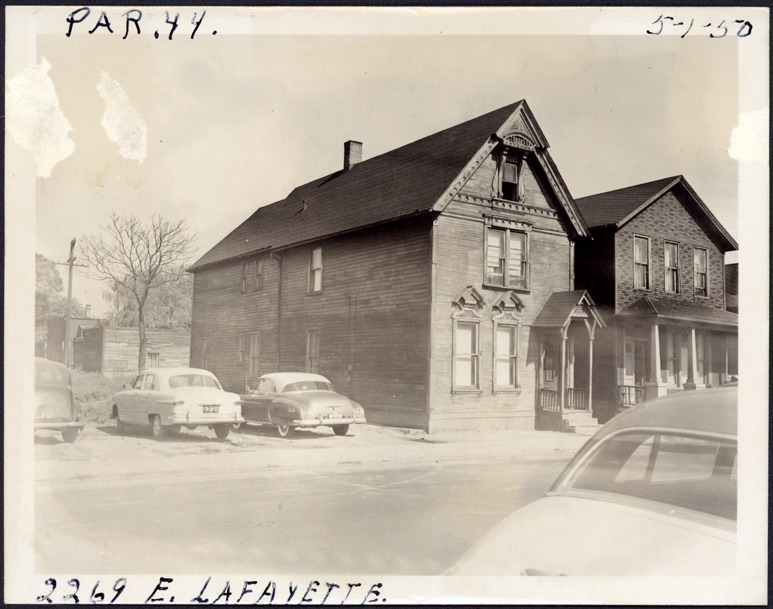 Front and side view of two-story front-gabled wooden-frame house located at 2269 E. Lafayette, parcel 44, in the area bounded by Dequindre/Chene/Lafayette/Monroe, site 2-S-4. Two automobiles parked in vacant lot next door. Partial view of residence at 2273 E. Lafayette. Handwritten on front: "Par. 44, 2269 E. Lafayette, 5-1-50." Surface of photograph is damaged.