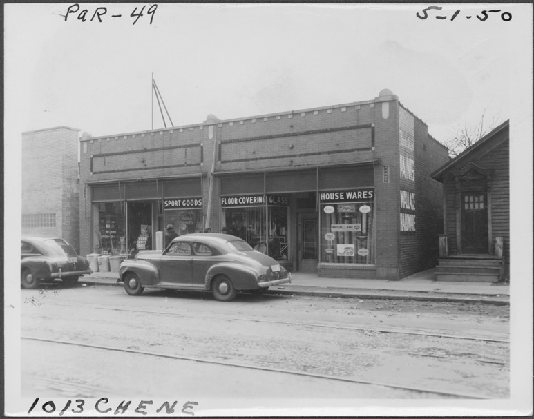 View of one-story brick building located at 1013 Chene, parcel 49, in the area bounded by Dequindre/Chene/Lafayette/Monroe, site 2-S-4. Painted on side of building: "Wallace Hardware." Signs in store windows: "Sport goods, floor covering, glass, house wares." Car parked in street. Handwritten on front: "Par. 49, 1013 Chene, 5-1-50."