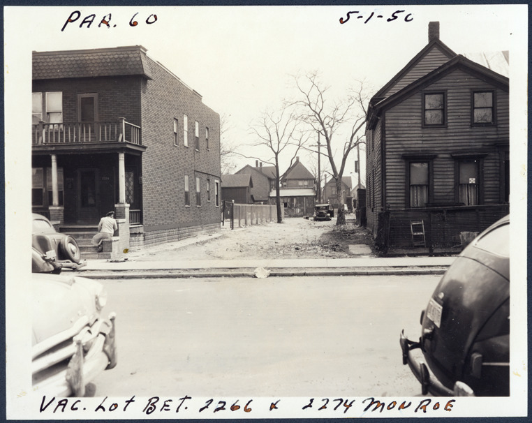 View of empty lot located between 2266 and 2274 Monroe, parcel 60, in the area bounded by Dequindre/Chene/Lafayette/Monroe, site 2-S-4. Woman sits on porch steps of adjacent residence at 2274-2276 Monroe. Handwritten on front: "Par. 60, vac. lot bet. 2266 & 2274 Monroe, 5-1-50."
