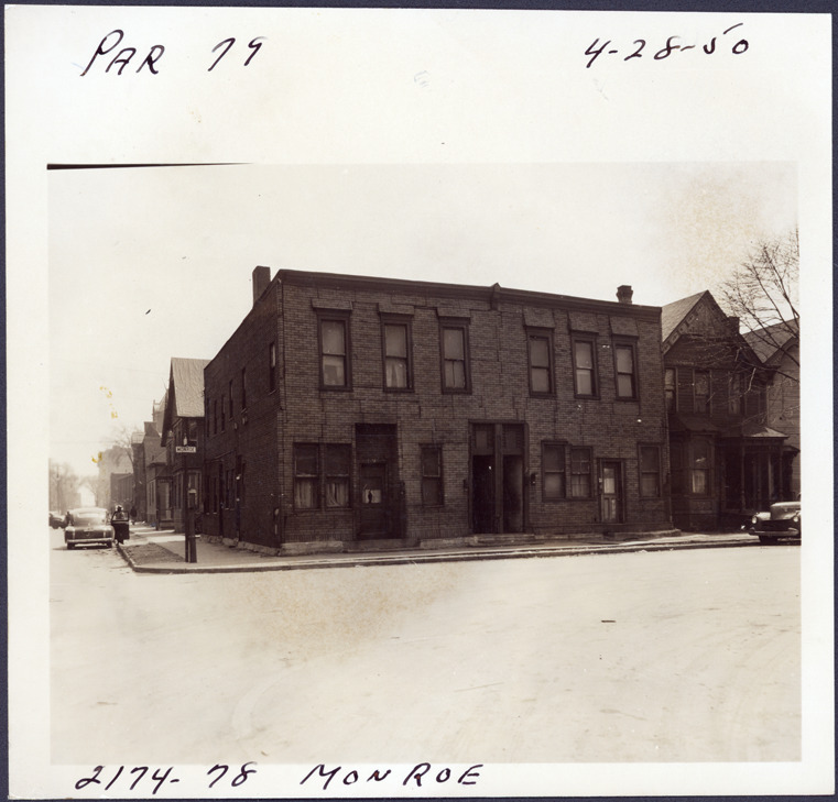 View of two-story residential building with simulated brick siding and flat roof located at 2174-2178 Monroe, parcel 79, in the area bounded by Dequindre/Chene/Lafayette/Monroe, site 2-S-4. Building has several front entrances. Handwritten on front: "Par. 79, 2174-78 Monroe, 4-28-50."