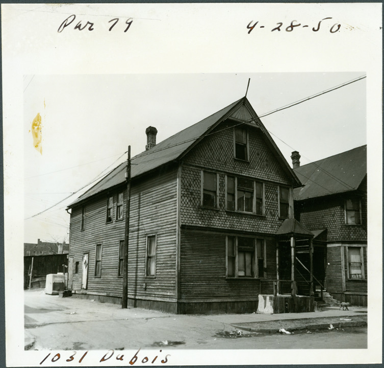 View of two-story front-gabled wooden-frame house located at 1031 Dubois, parcel 79, in the area bounded by Dequindre/Chene/Lafayette/Monroe, site 2-S-4. House has decorative shingles on facade and covered entry porch. Handwritten on front: "Par. 79, 1031 Dubois, 4-28-50."