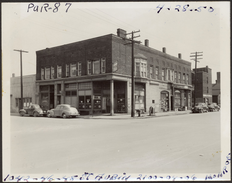 View of two-story brick building with storefronts located at 1042-1046-1048 St. Aubin and 2100-2104-2106 Monroe, parcel 87, in the area bounded by Dequindre/Chene/Lafayette/Monroe, site 2-S-4. Apartments on second story. Sign on corner business: " ... Bar-B-Q." Handwritten on front: "Par. 87, 1042-46-48 St. Aubin, 2100-04-06 Monroe, 4-28-50."