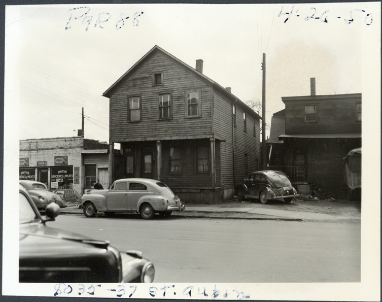 View of two-story front-gabled wooden-frame house located at 1035-1037 St. Aubin, parcel 88, in the area bounded by Dequindre/Chene/Lafayette/Monroe, site 2-S-4. Automobiles parked in street and next to house. Handwritten on front: "Par. 88, 1035-37 St. Aubin, 4-26-50."