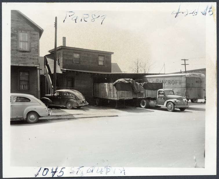 View of wooden-frame building located at 1045 St. Aubin, parcel 89, in the area bounded by Dequindre/Chene/Lafayette/Monroe, site 2-S-4. Trucks and truck trailer parked in front of building. "Bancroft" painted on side of one trailer. Handwritten on front: "Par. 89, 1045 St. Aubin, 4-26-50."