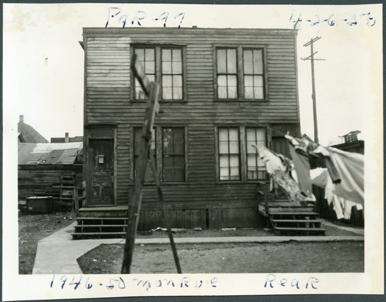 View of two-story wooden-frame house with flat roof located at 1946-1950 Monroe, at rear of 1952-1954 Monroe, parcel 97, in the area bounded by Dequindre/Chene/Lafayette/Monroe, site 2-S-4. Laundry hangs from clothesline. Handwritten on front: "Par. 97, 1946-50 Monroe, rear, 4-26-50."