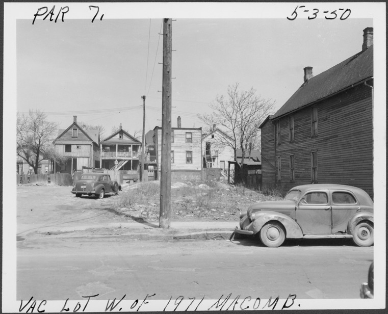 View of empty lot located west of 1971 Macomb, parcel 7, in the area bounded by Dequindre/Chene/Clinton/Macomb, site 2-S-6. Automobile parked in lot and in street; houses in background. Handwritten on front: "Par. 7, vac. lot W. of 1971 Macomb, 5-3-50."