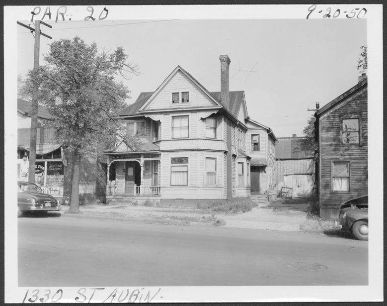 View of two-story Queen Anne style wooden-frame house with covered entry porch located at 1330 St. Aubin, parcel 20, in the area bounded by Dequindre/Chene/Clinton/Macomb, site 2-S-6. "To rent" sign in upstairs window. Sign in window of adjacent brick building: "Brite Star Laundry." Handwritten on front: "Par. 20, 1330 St. Aubin, 9-20-50."