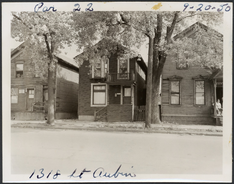 View of two-story front-gabled house with simulated brick siding located at 1318 St. Aubin, parcel 22, in the area bounded by Dequindre/Chene/Clinton/Macomb, site 2-S-6. Partial view of residences at 1322 St. Aubin and 1312 St. Aubin. Handwritten on front: "Par. 22, 1318 St. Aubin, 9-20-50."