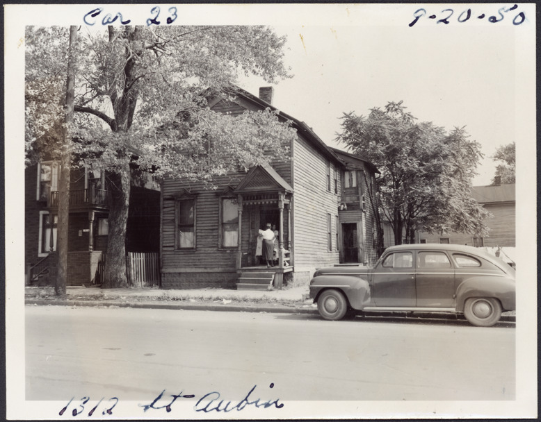 View of two-story front-gabled wooden-frame house located at 1312 St. Aubin, parcel 23, in the area bounded by Dequindre/Chene/Clinton/Macomb, site 2-S-6. House is partially obscured by trees; two women stand on porch; automobile parked in street. Handwritten on front: "Par. 23, 1312 St. Aubin, 9-20-50."