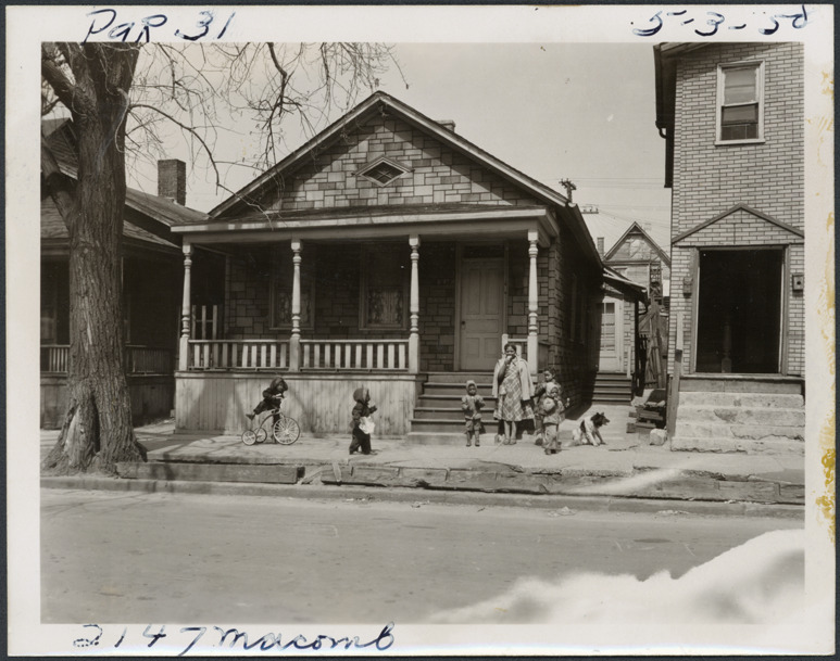 View of one-story house with simulated stone siding and covered entry porch located at 2147 Macomb, parcel 31, in the area bounded by Dequindre/Chene/Clinton/Macomb, site 2-S-6. Woman and several children stand in front of house; one child rides a tricycle; dog sits on sidewalk. Handwritten on front: "Par. 31, 2147 Macomb, 5-3-50."