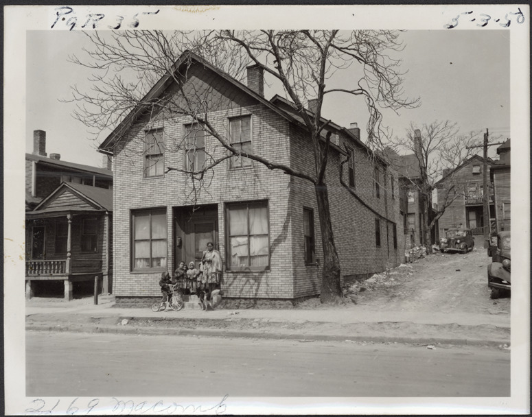 View of two-story front-gabled house with simulated brick siding located at 2169 Macomb, parcel 35, in the area bounded by Dequindre/Chene/Clinton/Macomb, site 2-S-6. Woman and several children stand in front of house; one child rides a tricycle. Handwritten on front: "Par. 35, 2169 Macomb, 5-3-50."