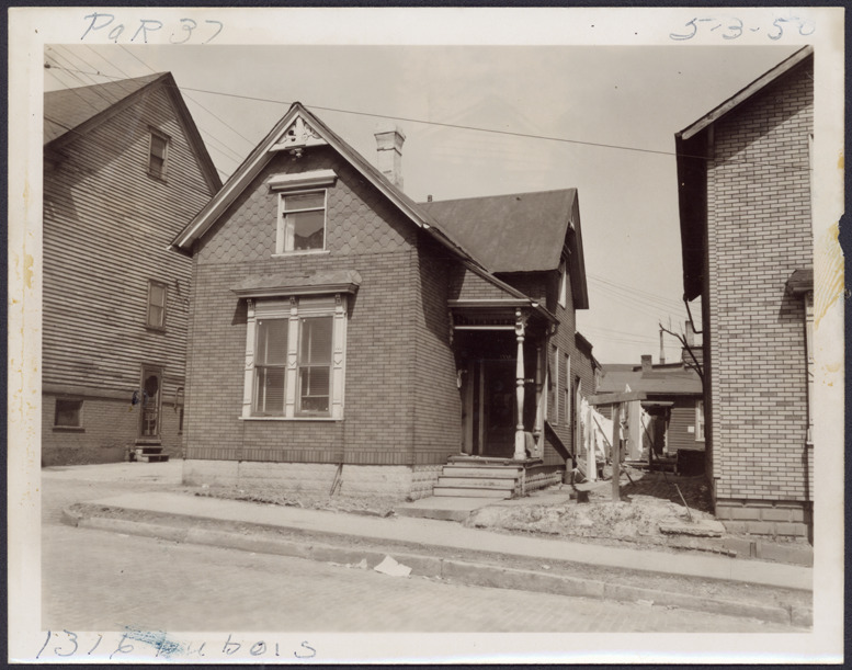 View of two-story house with simulated brick siding located at 1316 Dubois, parcel 37, in the area bounded by Dequindre/Chene/Clinton/Macomb, site 2-S-6. Handwritten on front: "Par. 37, 1316 Dubois, 5-3-50."