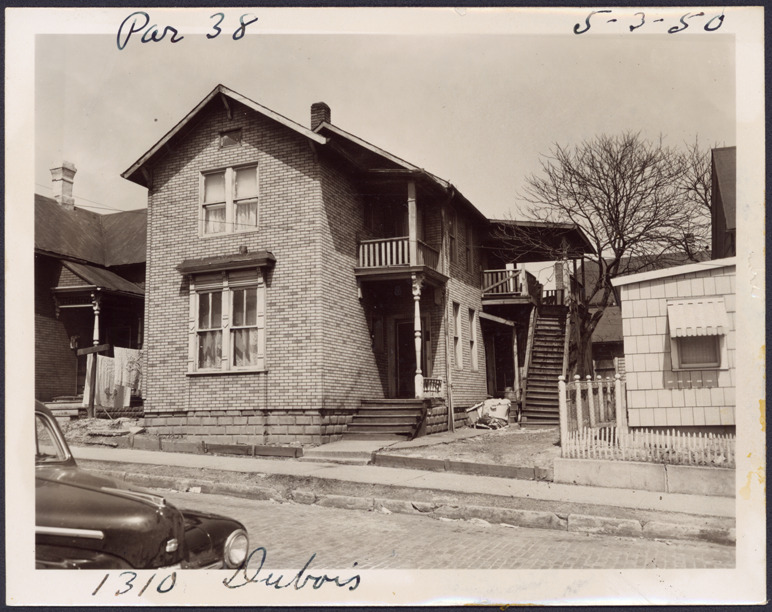 View of two-story house with simulated brick siding located at 1310 Dubois, parcel 38, in the area bounded by Dequindre/Chene/Clinton/Macomb, site 2-S-6. Staircase toward rear of house leads to second story. Handwritten on front: "Par. 38, 1310 Dubois, 5-3-50."