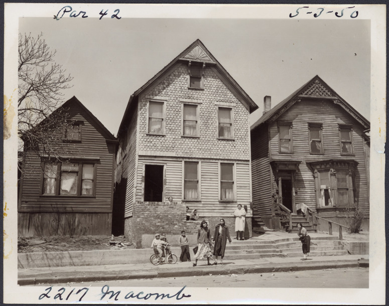 View of two-story wooden-frame house located at 2217 Macomb, parcel 42, in the area bounded by Dequindre/Chene/Clinton/Macomb, site 2-S-6. House has decorative shingles on facade; group of women and children gather in front of house. Partial view of residences at 2213 and 2223 Macomb. Handwritten on front: "Par. 41, 2217 Macomb, 5-3-50."