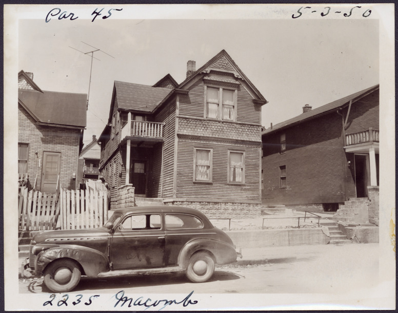 View of two-story wooden-frame house located at 2235 Macomb, parcel 45, in the area bounded by Dequindre/Chene/Clinton/Macomb, site 2-S-6. Car parked in street. Handwritten on front: "Par. 45, 2235 Macomb, 5-3-50."