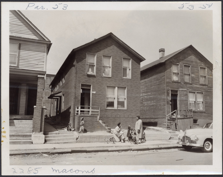 View of two-story front-gabled house with simulated brick siding located at 2285 Macomb, parcel 53, in the area bounded by Dequindre/Chene/Clinton/Macomb, site 2-S-6. Group of women and children gather in front of house. Partial view of residence at 2291 Macomb. Handwritten on front: "Par. 53, 2285 Macomb, 5-3-50."
