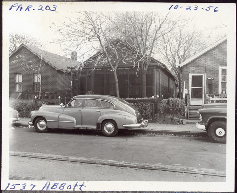 View of one-story house with simulated brick siding and enclosed front porch located at 1537 Abbott, parcel 203, in Corktown. Cars parked in street. Handwritten on front: "Par. 203, 1537 Abbott, 10-23-56."