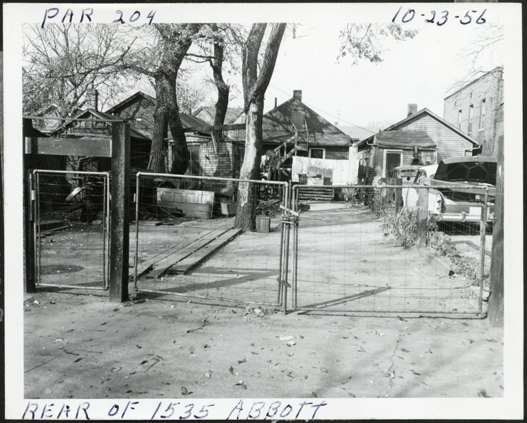 Rear view of one-story house with simulated brick siding located at 1535 Abbott, parcel 204, in Corktown. Wire and metal gate borders yard at alley; laundry hangs on clothesline next to house. Handwritten on front: "Par. 204, rear of 1535 Abbott, 10-23-56."