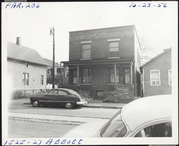 View of two-story brick house with flat roof located at 1525-1527 Abbott, possibly a duplex, parcel 206, in Corktown. House has two front entrances and covered entry porches; car parked in street. Handwritten on front: "Par. 206, 1525-27 Abbott, 10-23-56."
