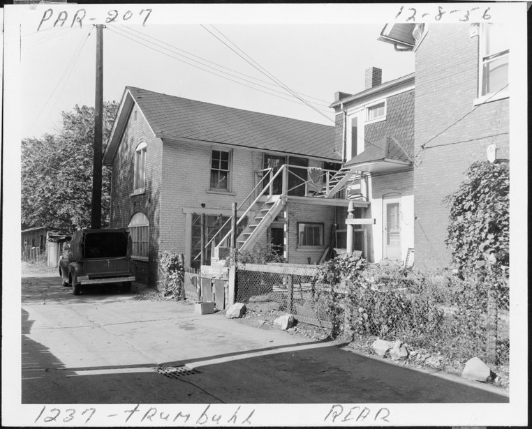 Side view from alley of two-story front-gabled brick house located at the rear of 1237 Trumbull, parcel 207, in Corktown. Vines grow over fence bordering alley; house has back staircase. Truck parked in alley. Handwritten on front: "Par. 207, 1237 Trumbull, rear, 12-8-56 [should be 10-8-56]."