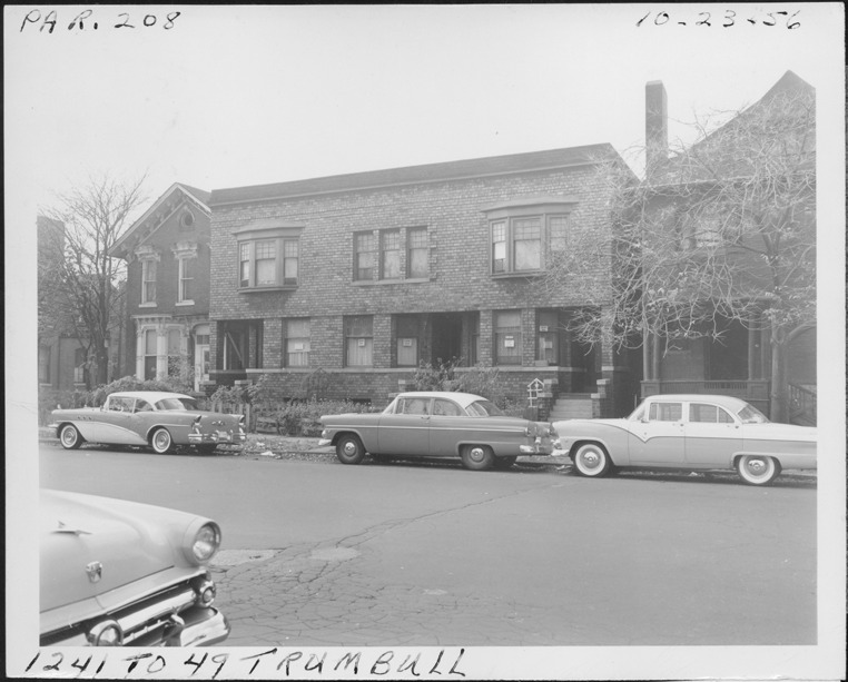 View of two-story brick row houses located at 1241-1245-1249 Trumbull, parcel 208, in Corktown. Building has three front entrances, flat roof and bay windows; cars parked in street. "Sleeping rooms" signs displayed in windows. Handwritten on front: "Par. 208, 1241 to 49 Trumbull, 10-23-56."