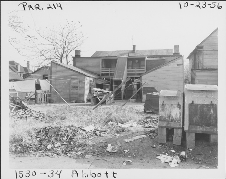 Rear view of two-story wooden-frame house located at 1530-1534 Abbott, parcel 214, in Corktown. House has two one-story wings with sloping roofs in rear. Covered staircase leads to second floor balcony. Concrete trash bins in foreground; ground is covered with debris. Handwritten on front: "Par. 214, 1530-34 Abbott, 10-23-56."