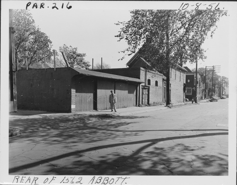 View at an angle of cement garage with flat roof and wooden doors located behind 1562 Abbott, parcel 216, in Corktown. Man stands on sidewalk. Handwritten on front: "Par. 216, rear of 1562 Abbott, 10-8-56."