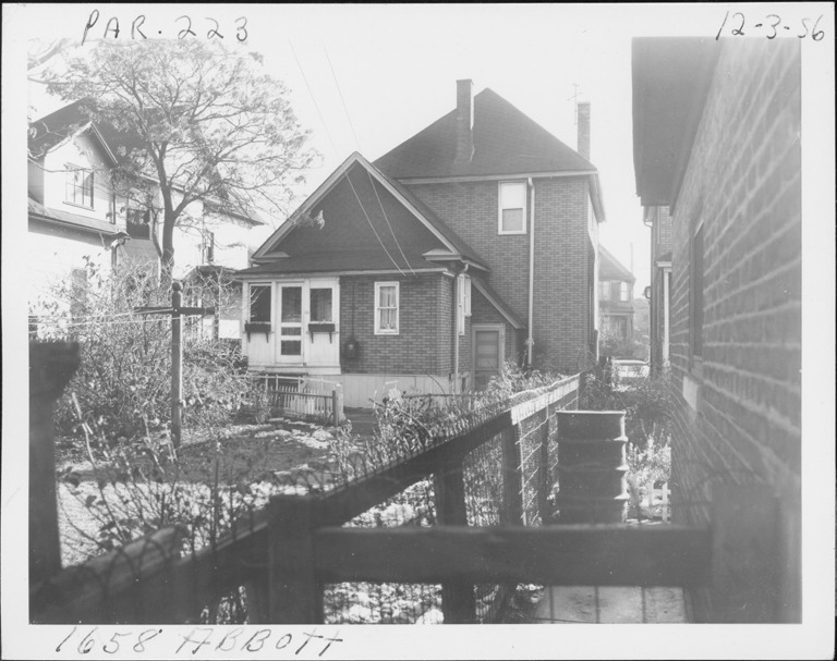 Rear view of two-story house with simulated brick siding located at the rear of 1658 Abbott, parcel 223, in Corktown. Clothesline in backyard. Handwritten on front: "Par. 223, 1658 Abbott, 12-3-56."