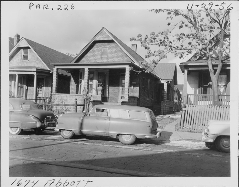 Front and side view of one-story house with simulated brick siding and covered entry porch located at 1674 Abbott, parcel 226, in Corktown. Porch is covered with simulated stone siding; automobiles parked in street. Handwritten on front: "Par. 225, 1670 Abbott, 11-29-56."