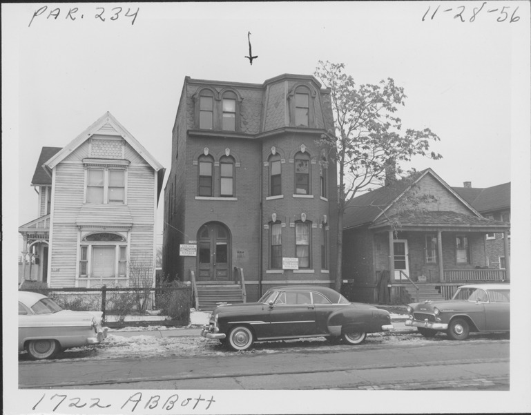 View of three-story brick Second Empire style house with turret located at 1722 Abbott, parcel 234, in Corktown. "For sale, Benj. Rich" signs on house; cars parked in street. View of residences at 1716 and 1726 Abbott. Arrow drawn on photograph points toward house in center. Handwritten on front: "Par. 234, 1722 Abbott, 11-28-56."