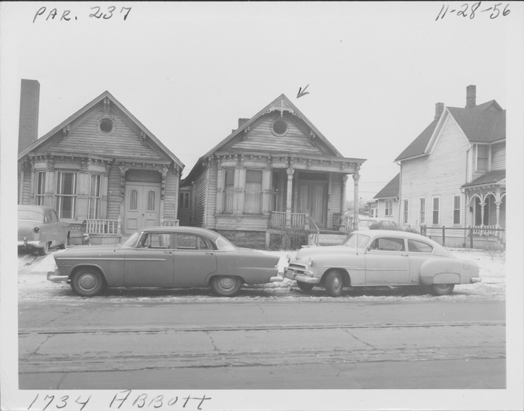 View of one-story front-gabled wooden-frame house with covered entry porch located at 1734 Abbott, parcel 237, in Corktown. Cars parked in street. Partial view of residence at 1736 Abbott. Handwritten on front: "Par. 237, 1734 Abbott, 11-28-56."