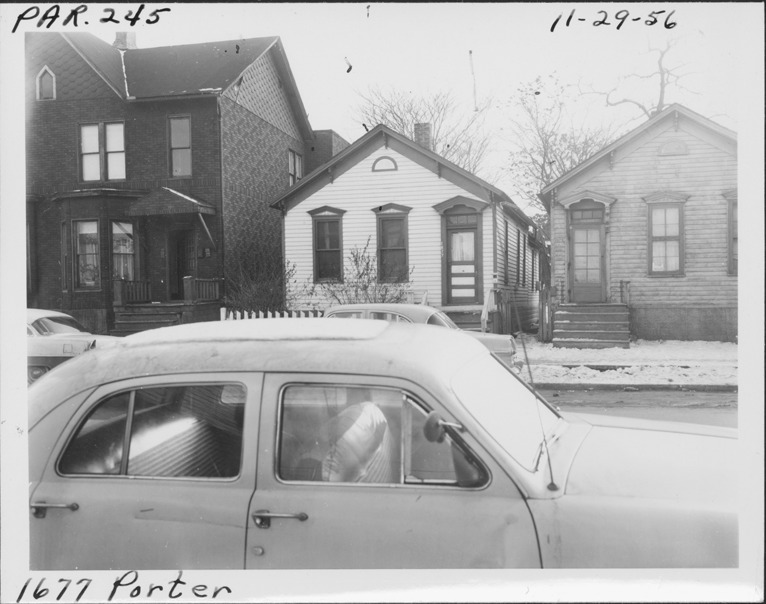 View of one-story front-gabled wooden-frame house located at 1677 Porter, parcel 245, in Corktown. Automobile in foreground. Handwritten on front: "Par. 245, 1677 Porter, 11-29-56."