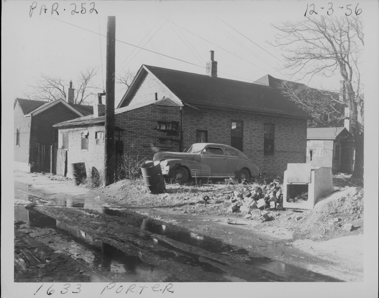 Rear and side view of one-story front-gabled house with simulated brick siding located at 1631 Porter, at the rear of 1633 Porter, parcel 252, in Corktown. Car parked next to house. Handwritten on front: "Par. 252, 1633 [should be 1631] Porter, 12-3-56."