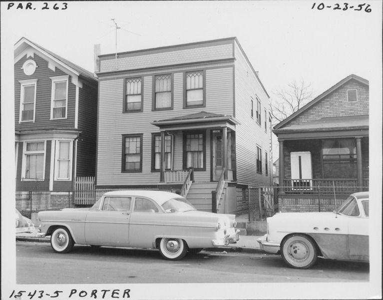 View of two-story wooden-frame house with flat roof and covered entry porch located at 1543-1545 Porter, parcel 263, in Corktown. Cars parked in street. Handwritten on front: "Par. 263, 1543-5 Porter, 10-23-56."