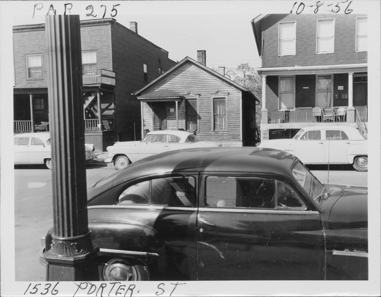 View of one-story front-gabled wooden-frame house located at 1536 Porter, parcel 275, in Corktown. Automobiles parked in street. Handwritten on front: "Par. 275, 1536 Porter St., 10-8-56."