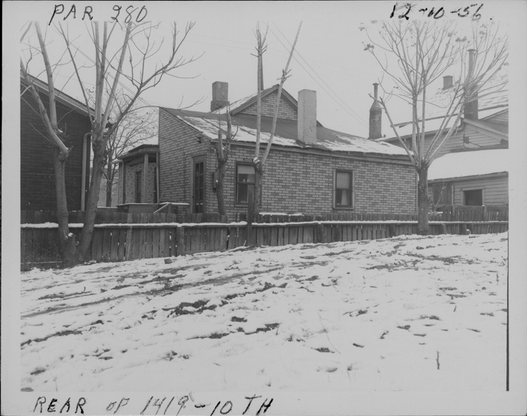 Rear and side view of one-story front-gabled house with simulated brick siding located at 1419 10th St., parcel 280, in Corktown. Snow-covered yard in foreground. Handwritten on front: "Par. 280, rear of 1419 10th, 12-10-56."