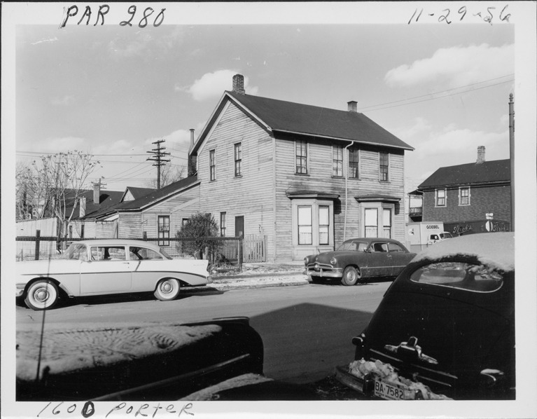 Front and side view of two-story side-gabled wooden-frame house located at 1600 Porter, parcel 280, in Corktown. Cars parked in street. Handwritten on front: "Par. 280, 1600 Porter, 11-29-56."