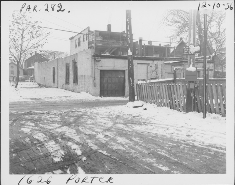Rear view of one-story brick and concrete block building located at 1620 Porter, parcel 282, in Corktown. Building has garage door in back of building; alley in foreground. Handwritten on front: "Par. 282, 1626 [should be 1620] Porter, 12-10-56."