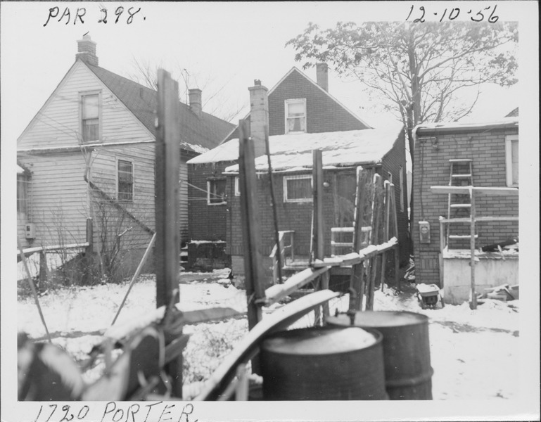 Rear view of house with simulated brick siding located at 1720 Porter, parcel 298, in Corktown. Handwritten on front: "Par. 298, 1720 Porter, 12-10-56."