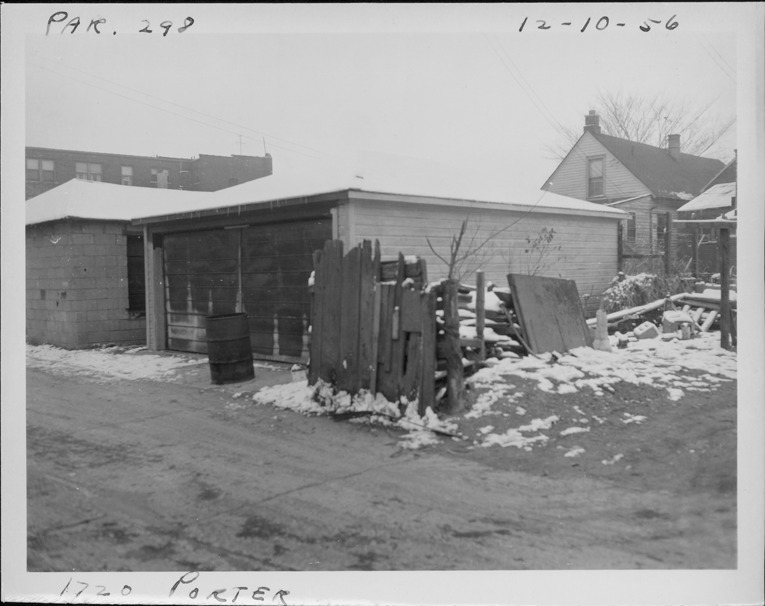 View from alley of wooden-frame garage located at the rear of 1720 Porter, parcel 298, in Corktown. Portion of wooden fence borders alley; trash can in front of garage. Handwritten on front: "Par. 298, 1720 Porter, 12-10-56."