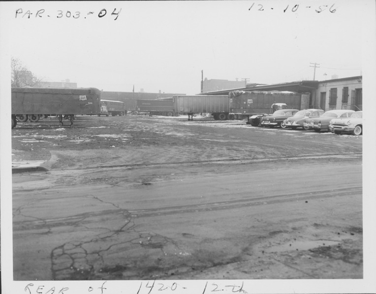 Rear view of one-story brick building with truck terminal and adjacent lot located at 1420 12th St. at the northeast corner of 12th St. and Porter, parcels 303 and 304, in Corktown. Truck trailers and cars parked next to building and in lot. Handwritten on front: "Par. 303-04, rear of 1420 12th, 12-10-56." 1956 City Directory lists Inter City Truck Lines Ltd. trucking at 1420 12th St.