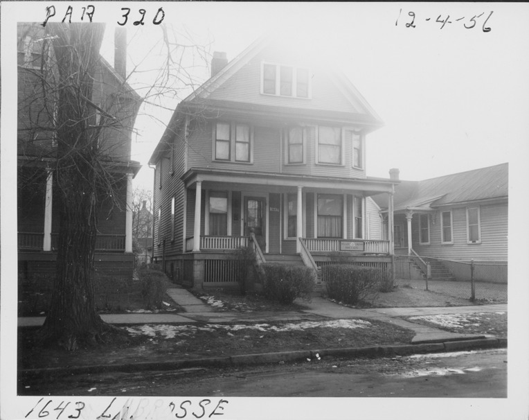 View of two-story front-gabled wooden-frame house with covered entry porch located at 1643 Labrosse, parcel 320, in Corktown. Sign on porch railing: "Vella's Repair, home & auto." Handwritten on front: "Par. 320, 1643 Labrosse, 12-4-56."
