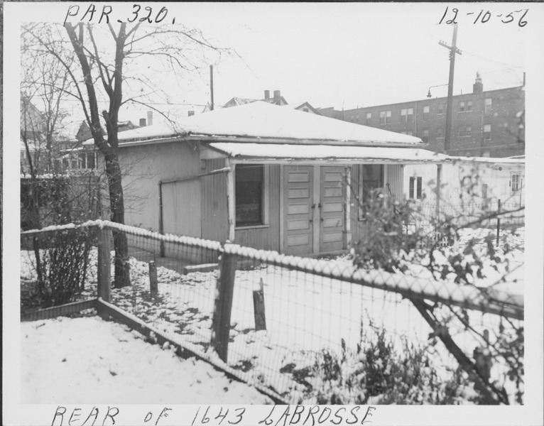 View from backyard of board and batten garage located at the rear of 1643 Labrosse, parcel 320, in Corktown. Fence in foreground. Handwritten on front: "Par. 320, rear of 1643 Labrosse, 12-10-56."