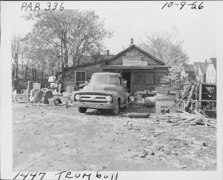 View of wooden-frame building and truck inside salvage yard located at 1447 Trumbull, parcel 336, in Corktown. Metal parts and household fixtures on both sides of truck. Handwritten on front: "Par. 336, 1447 Trumbull, 10-9-56." 1956 City Directory lists Arch Wrecking & Salvaging Co. at 1447 Trumbull.