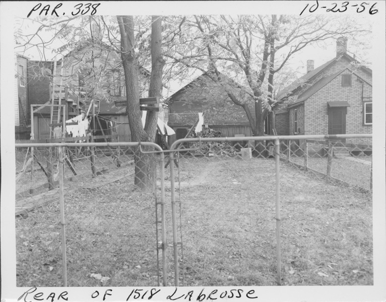 Rear view of one-story front-gabled wooden-frame house located at 1518 Labrosse, parcel 338, in Corktown. Pile of lumber or firewood stacked next to house; chain link fence in foreground. Handwritten on front: "Par. 338, rear of 1518 Labrosse, 10-23-56."